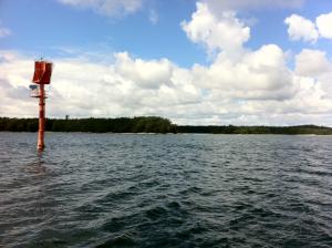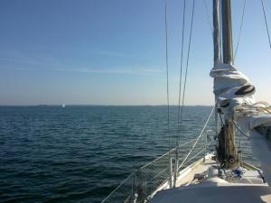 Matkalla kohti kuharantaa. Porkkalanniemen päässä näkyy sumua. 60n00.9 24e34.2