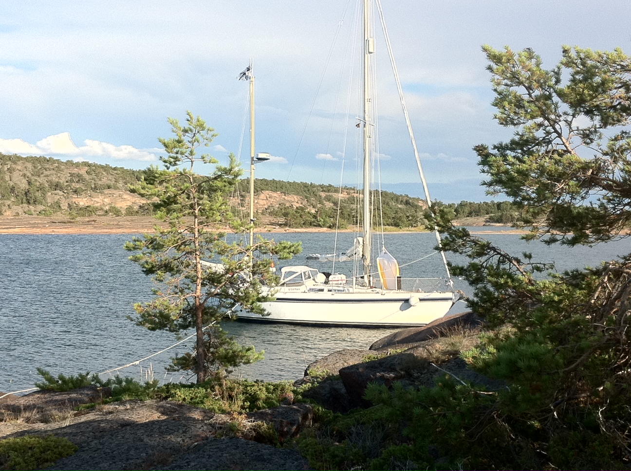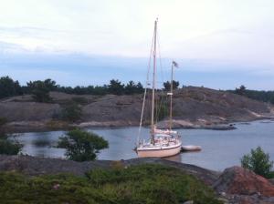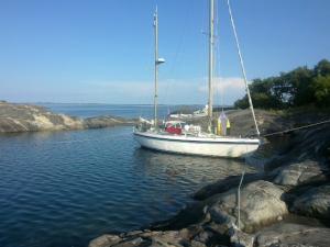 Nelipistekiinnitys on muotia. Pitkästä aikaa keula maissa. Tähän koloon ei mahdu ankkuriin. 60n15.9 20e44.1 Auringonlasku. Sirkkojen siritys. Katajan tuoksu. z