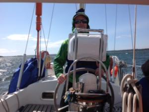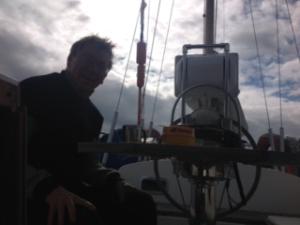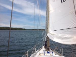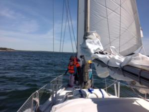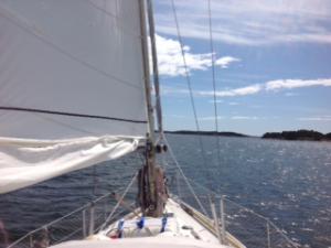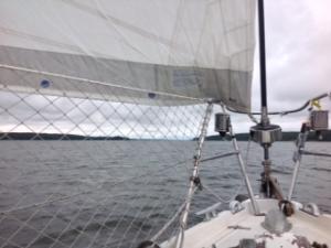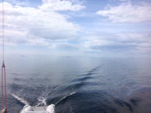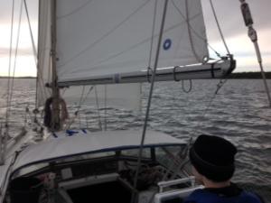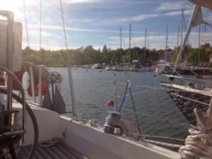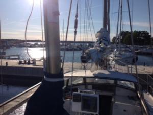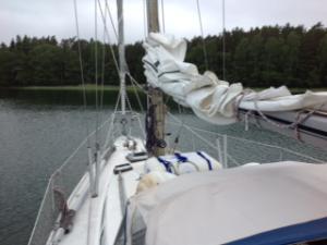 Tuuli oli aamulla aika kova, mutta tankkasimme diseliä ja tyhjensimme septitankin ennen kuin lähdimme liikkeelle. Tuuli oli kuitenkin sen verran kova että vastatuuleen koneella ajo ei kiinnostanut joten teimme u-käännöksen ja ajamme nyt kohti kuharantaa. Avasimme keulapurjetta pari metriä ja kuljemme nyt pelkällä keulapurjeen kulmalla 6 solmua. 59n59.4 22e44.7