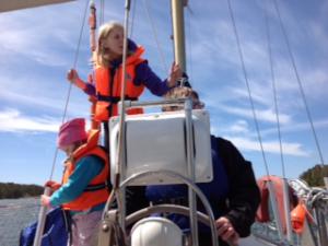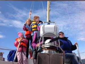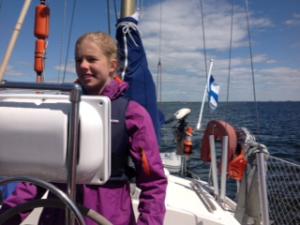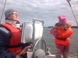 Tero, Anna, Lempi ja Konsta matkalla kohti Taalintehdasta. Taas vastatuuli ja tuulta on sen verran että ei jaksa purjehtia. 60n01.7 22e49.8