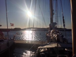 Ankkuriin Hamnholmeniin, tai sen Söderfladeniin. Nyt sitten päivällistä. Aamulla lähtö venyi, mutta sitten ajoimme aika pitkän matkan purjeilla ja ihan lopun koneella. Täällä oli jo yksi purjevene kulkuvalot päällä odottamassa ankkurissa. 60n01.3 22e21.5.